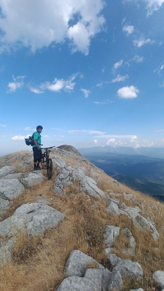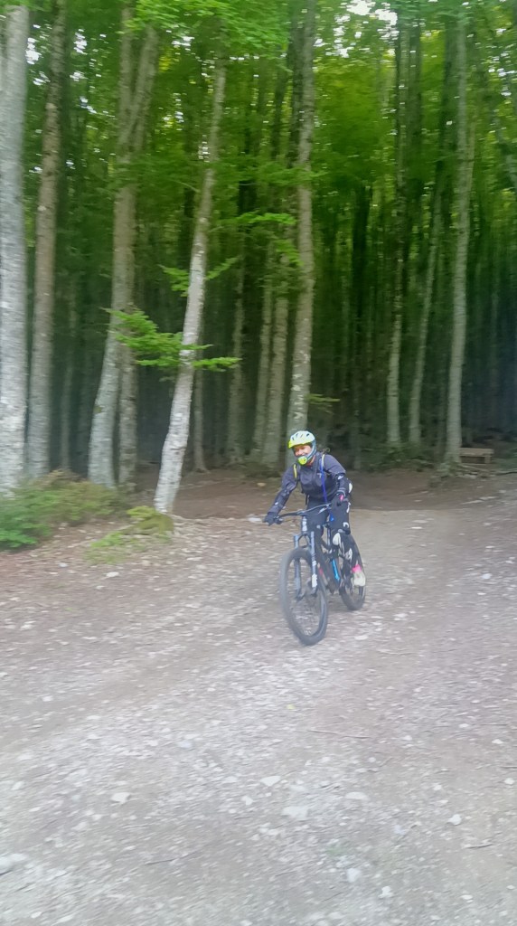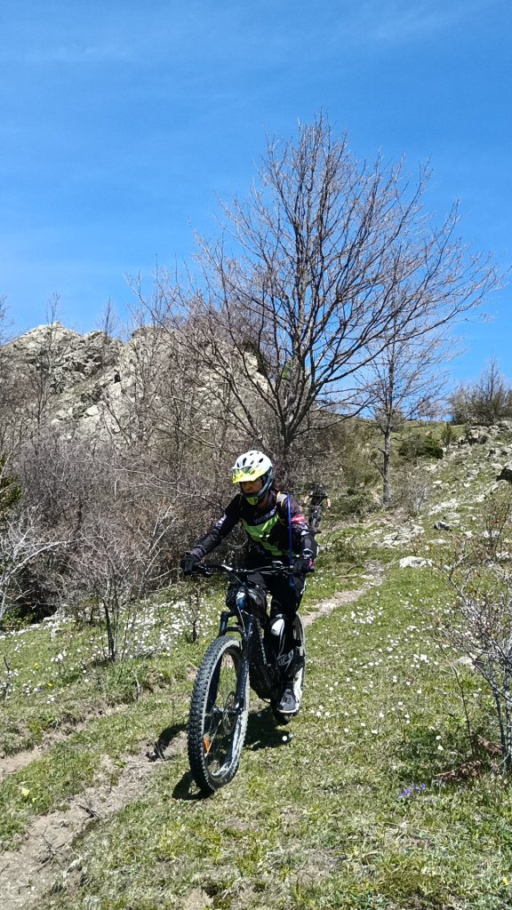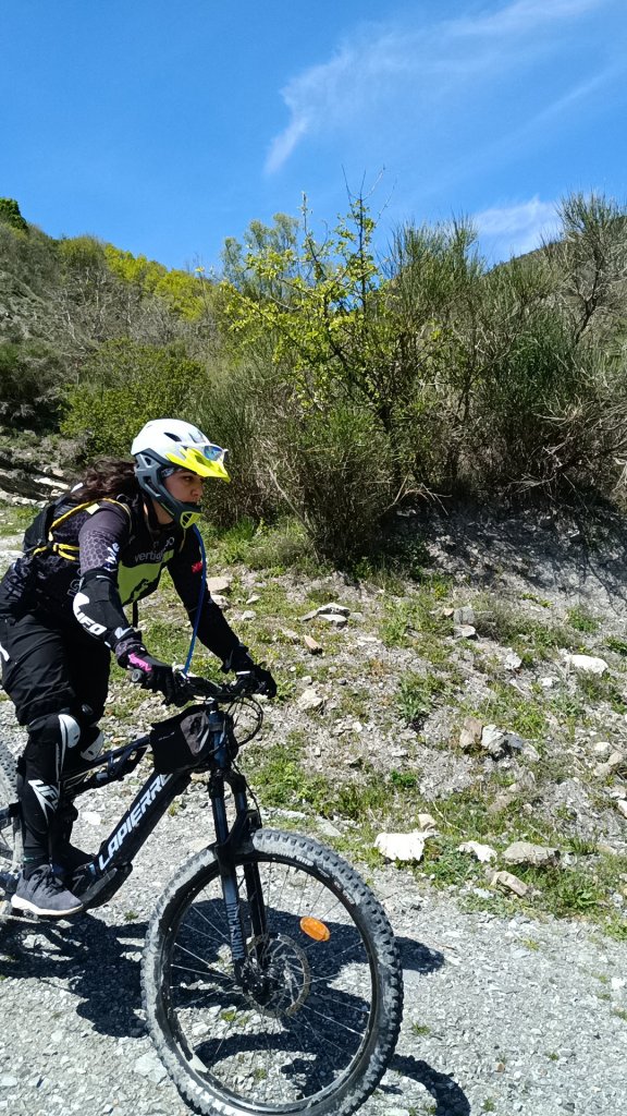 Dopo qualche minuto in vetta adrenalina sale, il pensiero di un lungo singletrak invade la mente . Passione, concentrazione, tecnica e un pizzico di paura invadono le nostre menti . Occorre indossare le protezioni, il gesto diventa attimo di meditazione, ultimi controlli alla MTB e giù …. Cercando linee perfette terreno insidioso e salti di roccia si perde quota rapidamente .